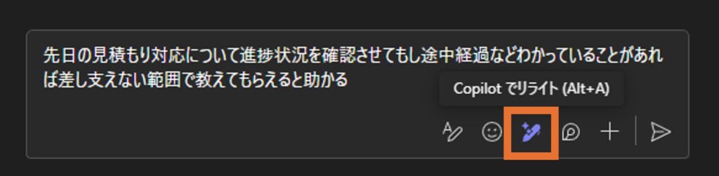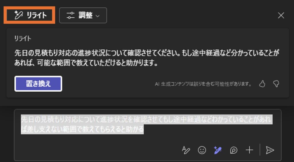 そのあと、Teamsの入力欄にある「リライト」ボタンを押すだけ。