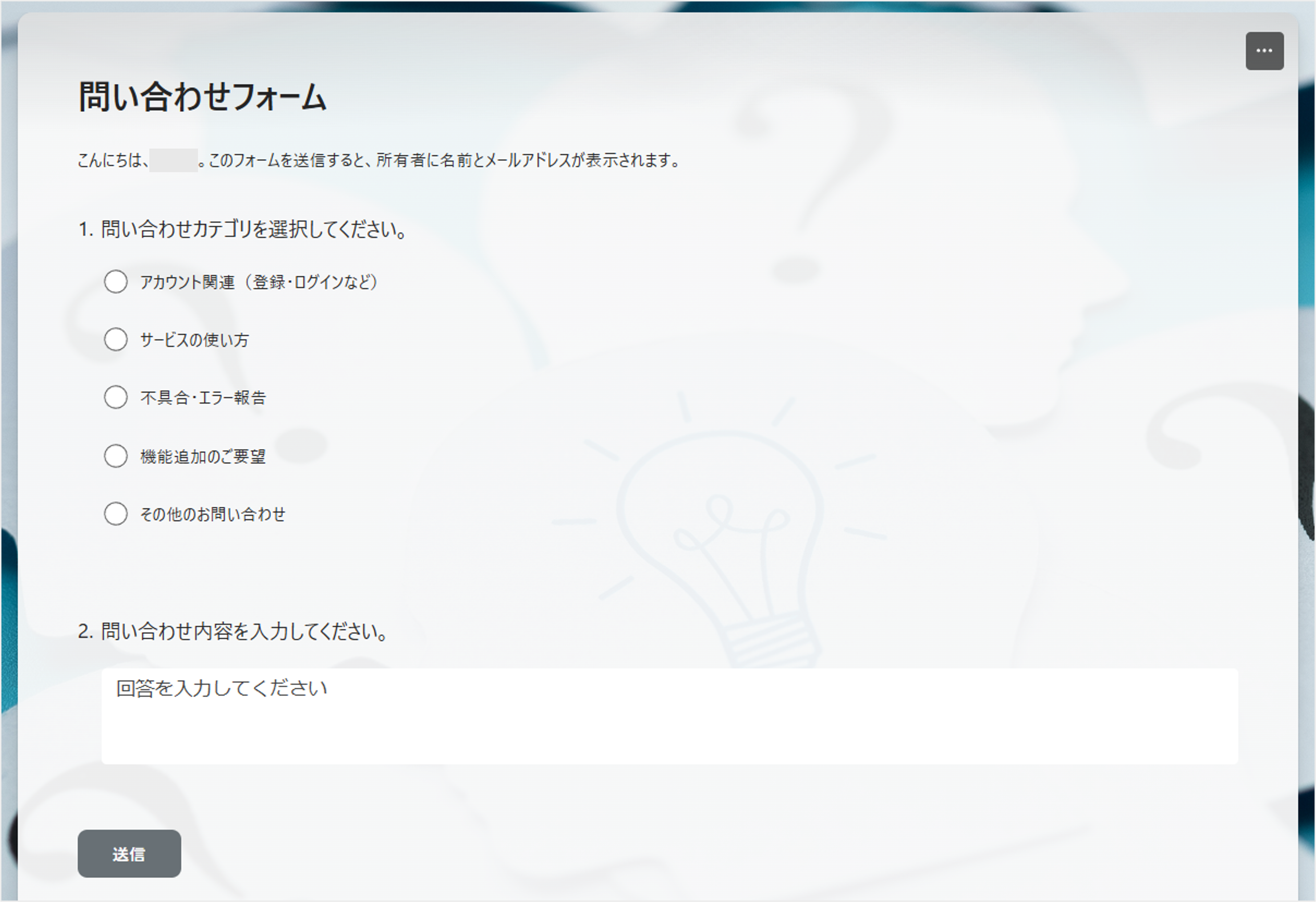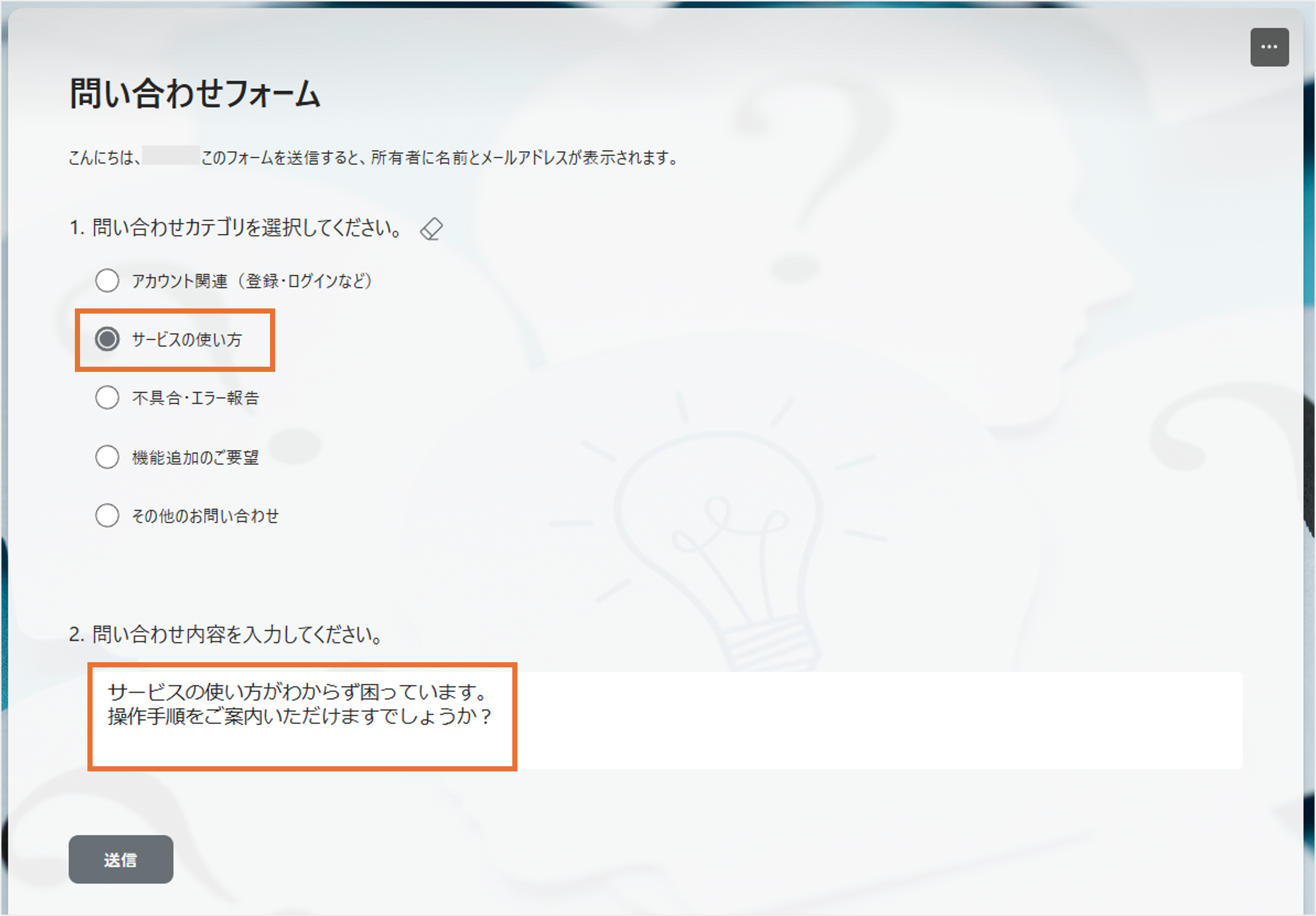 Formsで問い合わせカテゴリを「サービスの使い方」にして、回答を送信してみました。