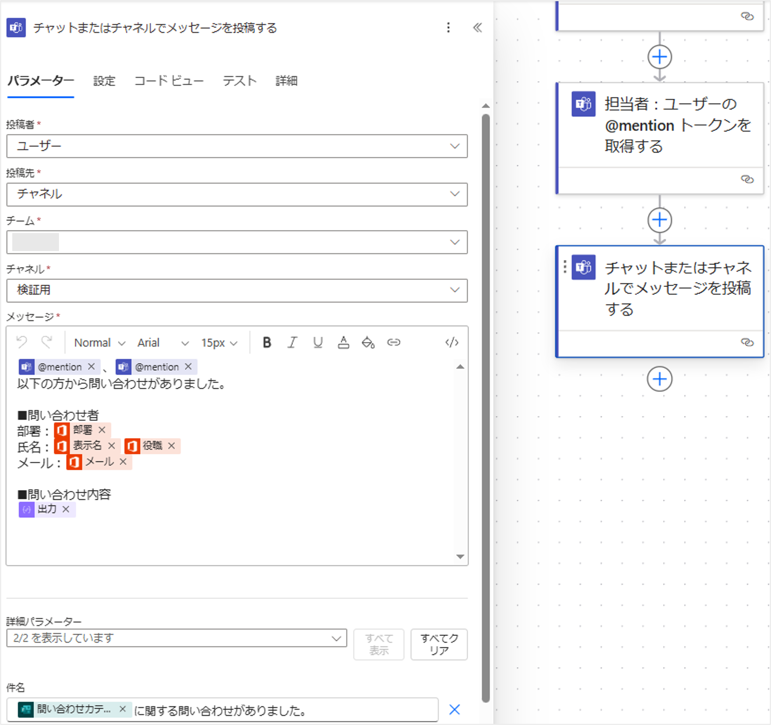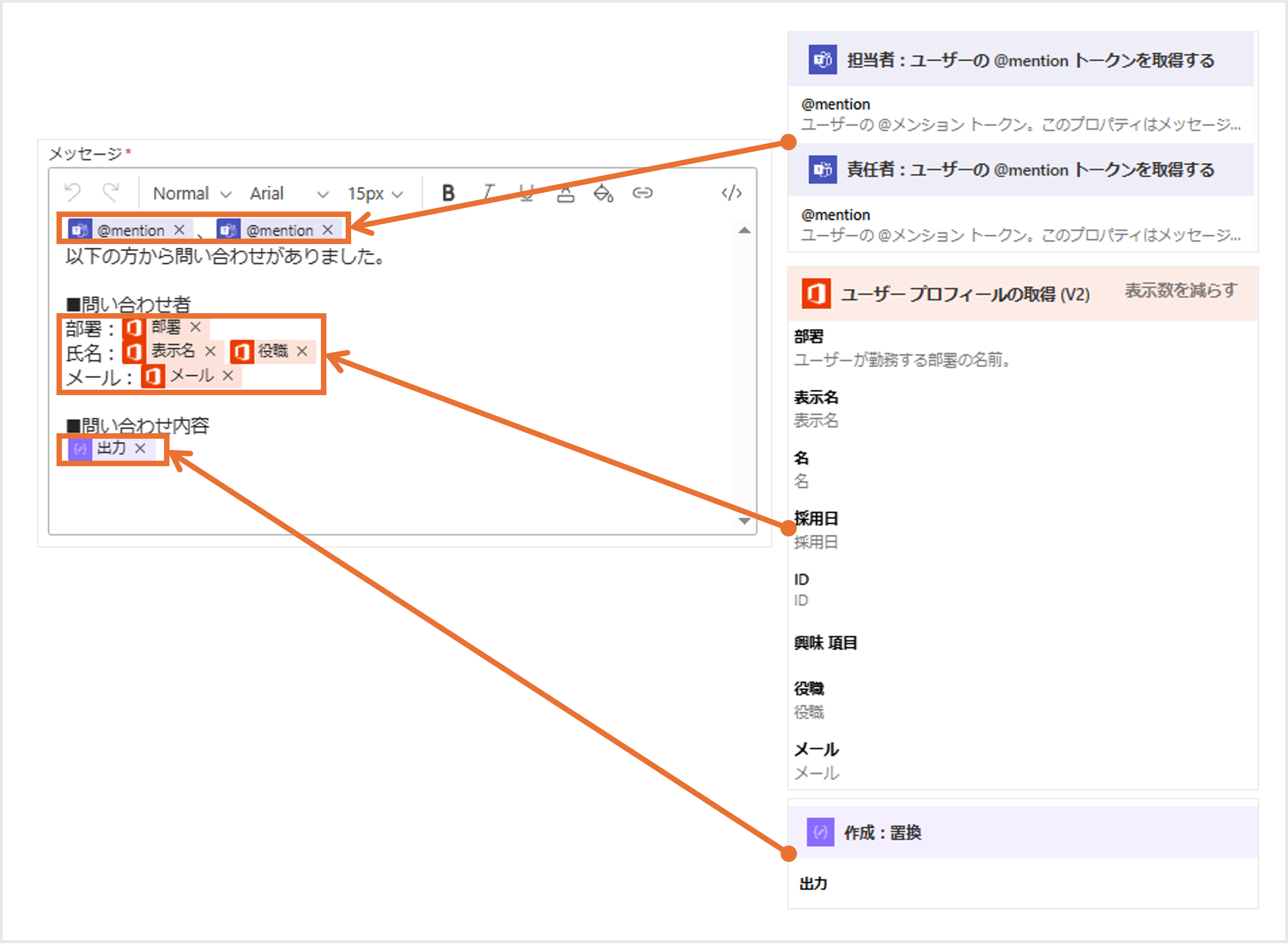 上2つの作成アクションは、Formsの「問い合わせ内容を入力してください」が改行が含まれたテキストだった場合、Teamsにも改行付きで投稿するために必要なアクションになります。