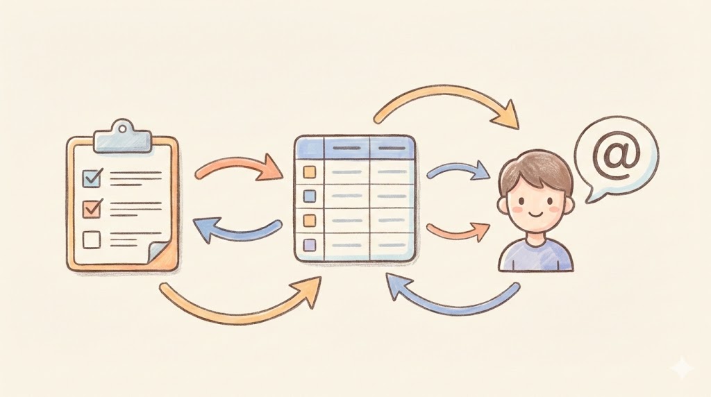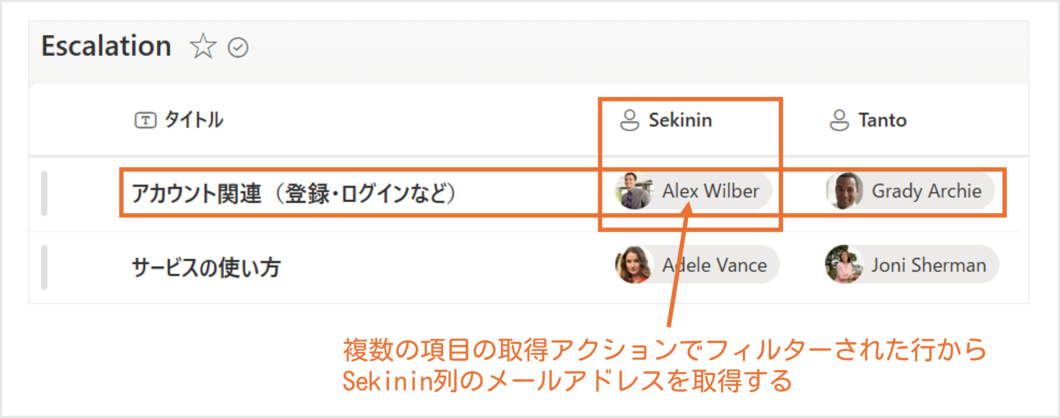 ouputs関数は、「複数の項目の取得」でフィルターされた行から、Tanto列のメールアドレスを取得します。