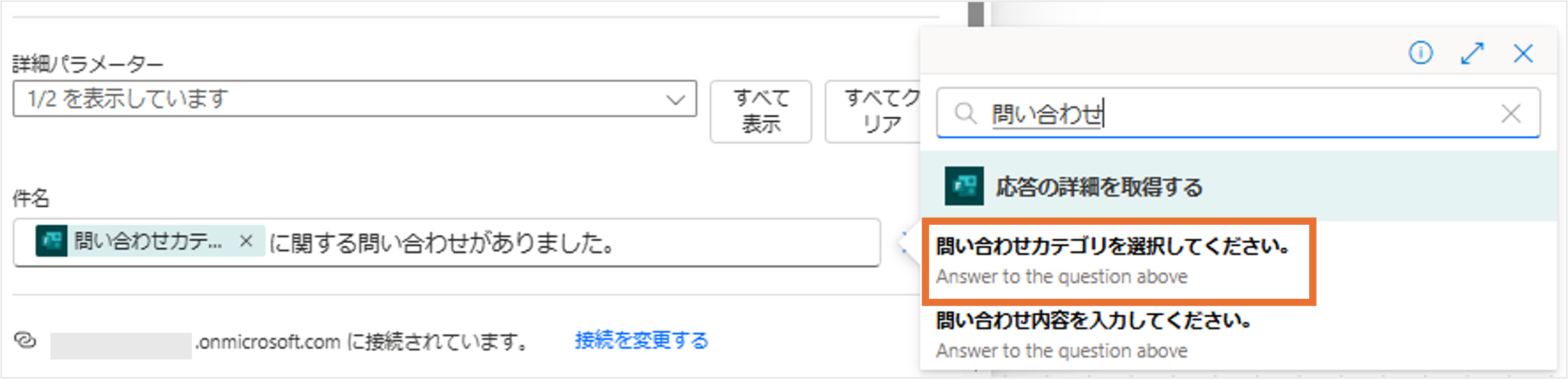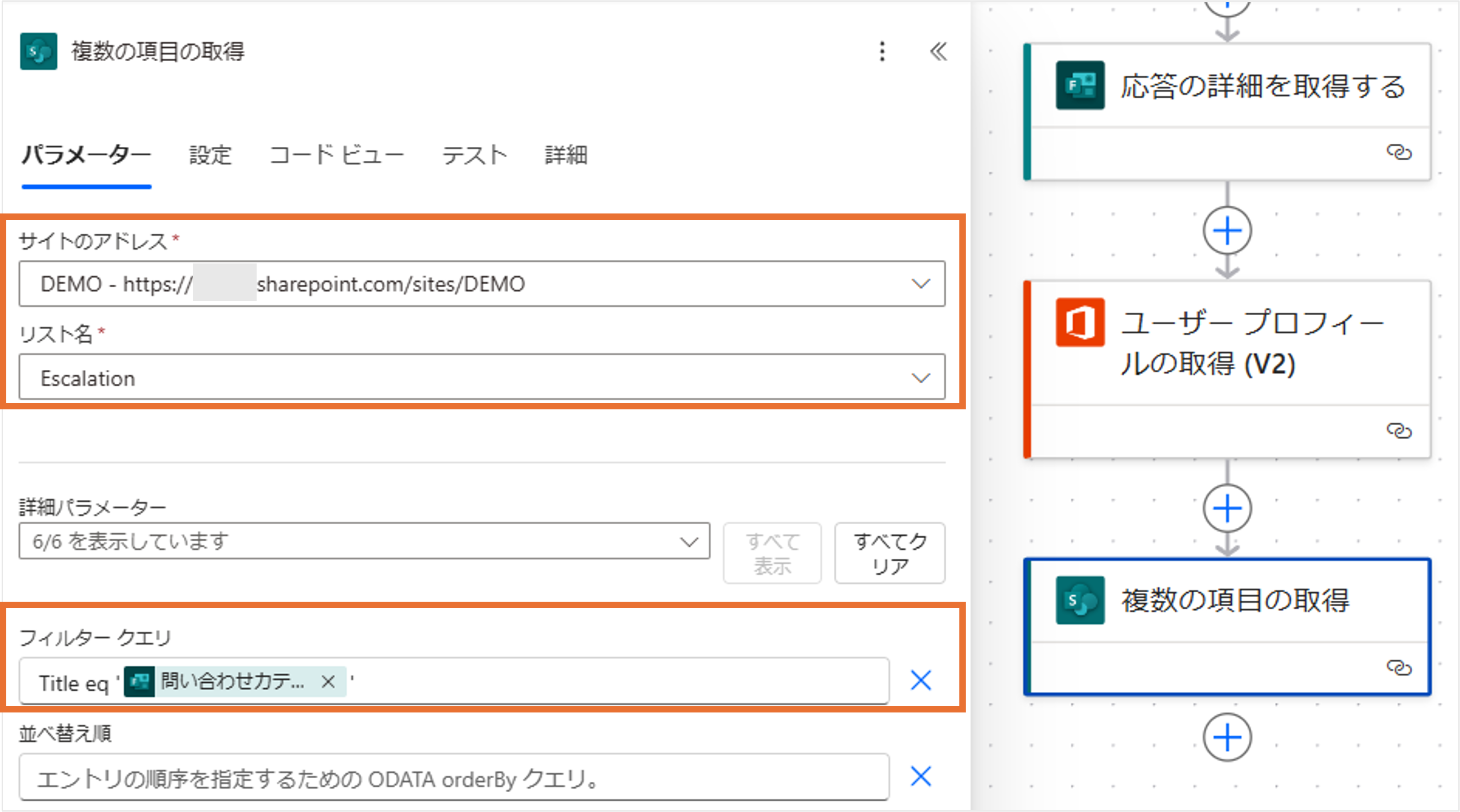 フィルタークエリには、Title eq ” までを入力し、”の間に、「応答の詳細を取得する」アクションの「問い合わせカテゴリを選択してください」を設定してください。