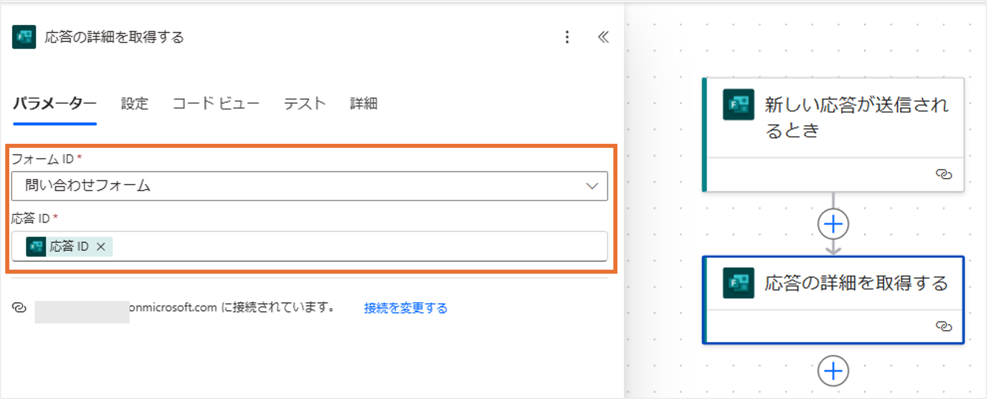 Microsoft Formsの「応答の詳細を取得する」アクションを追加し、以下パラメーターを設定します。