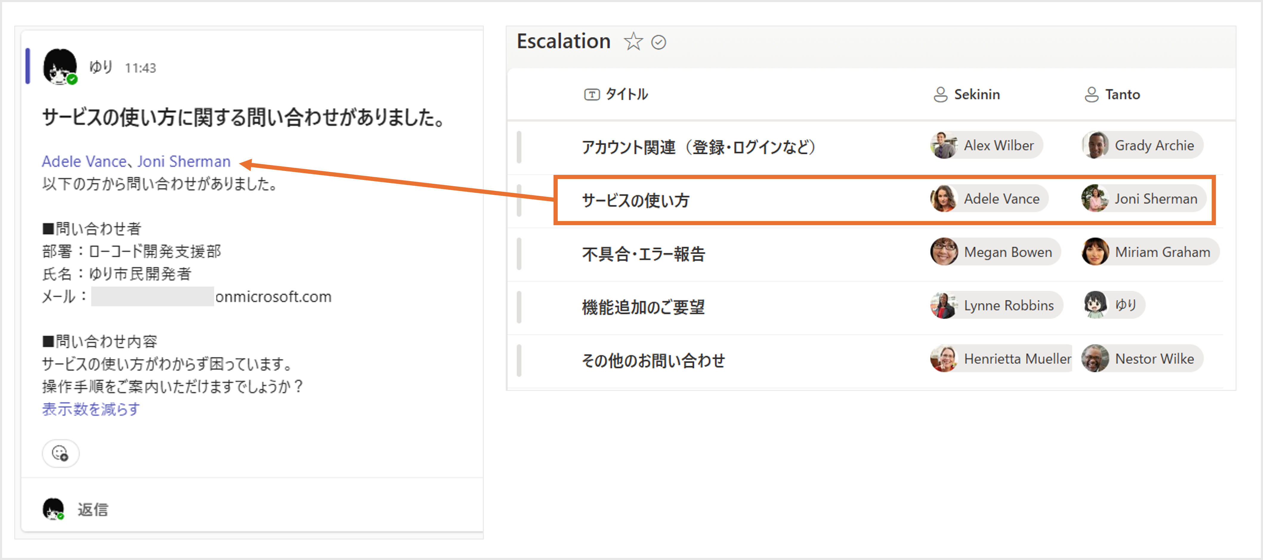 Teamsチャネルに投稿され、SharePointリストの「サービスの使い方」で設定していた責任者と担当者にメンションがいきました。