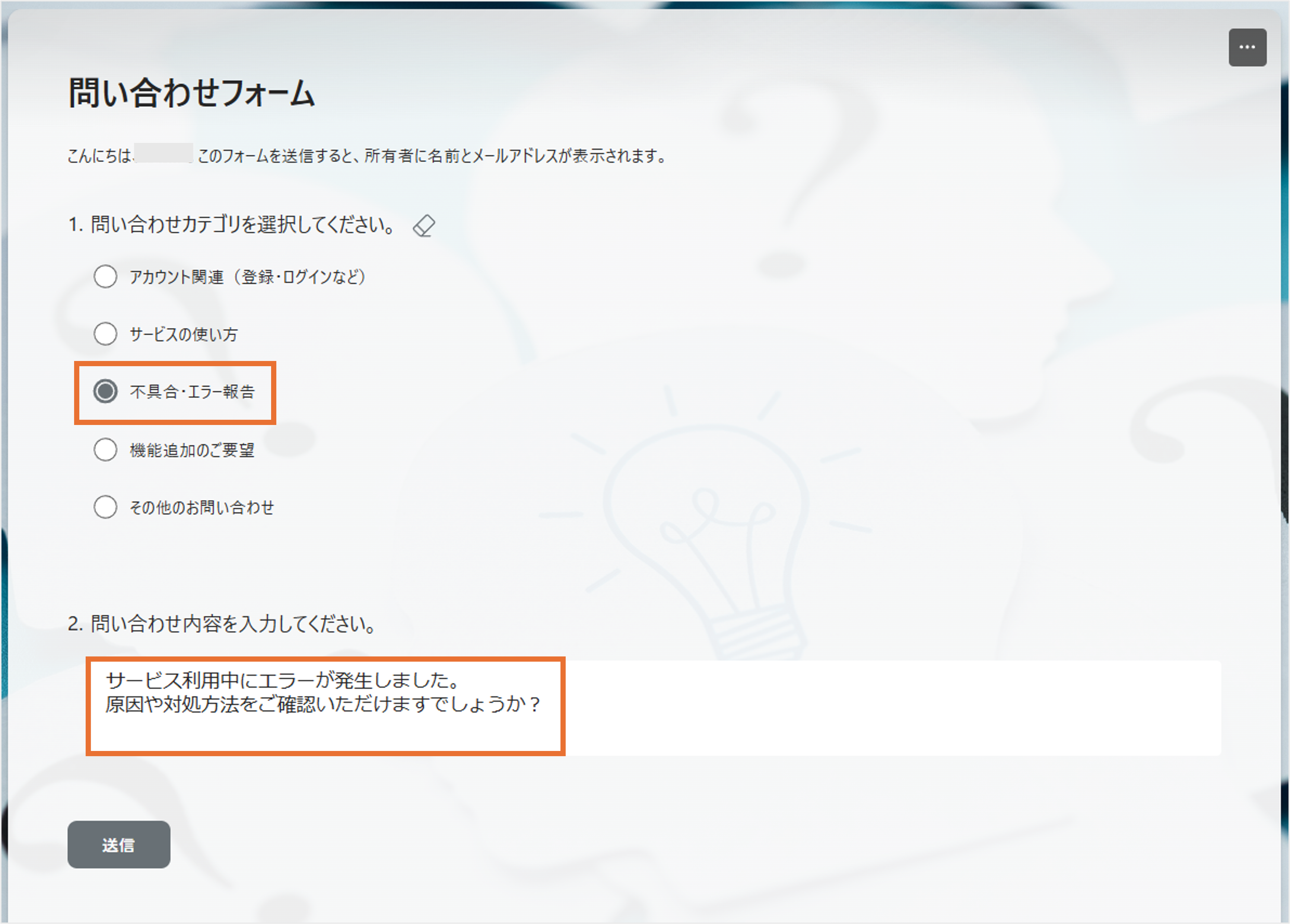 今度は、問い合わせカテゴリを「不具合・エラー報告」にしてみます。