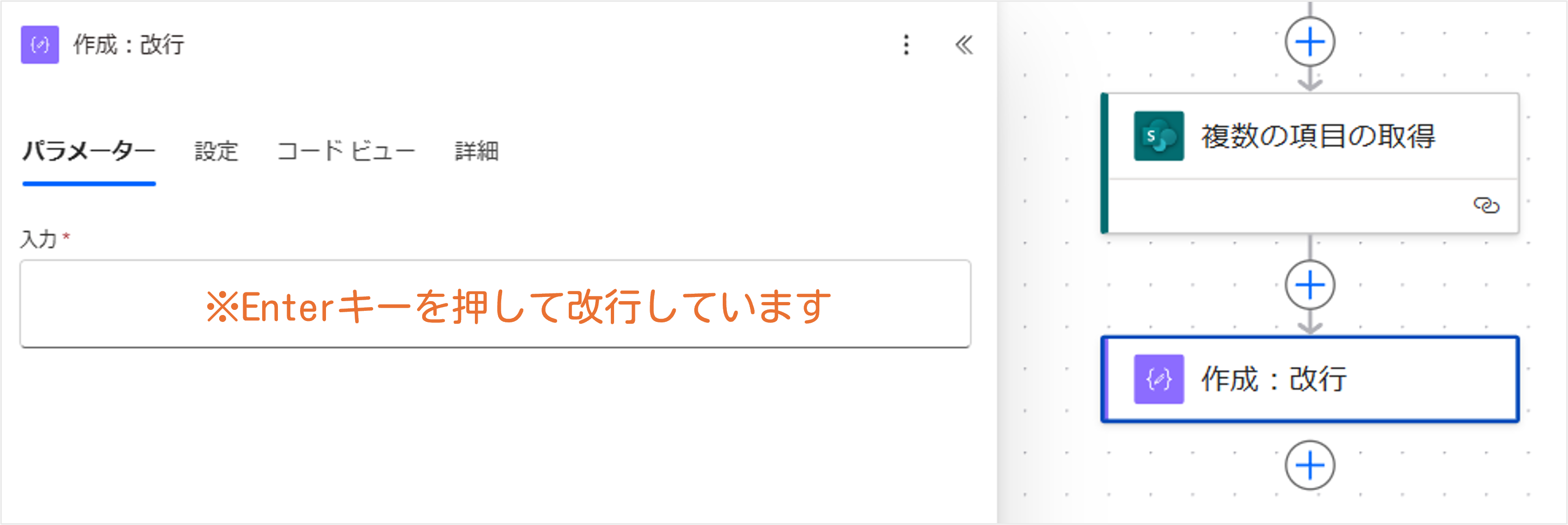 データ操作の「作成」アクションを追加し、入力にEnterキーを押して改行されたものを作成します。