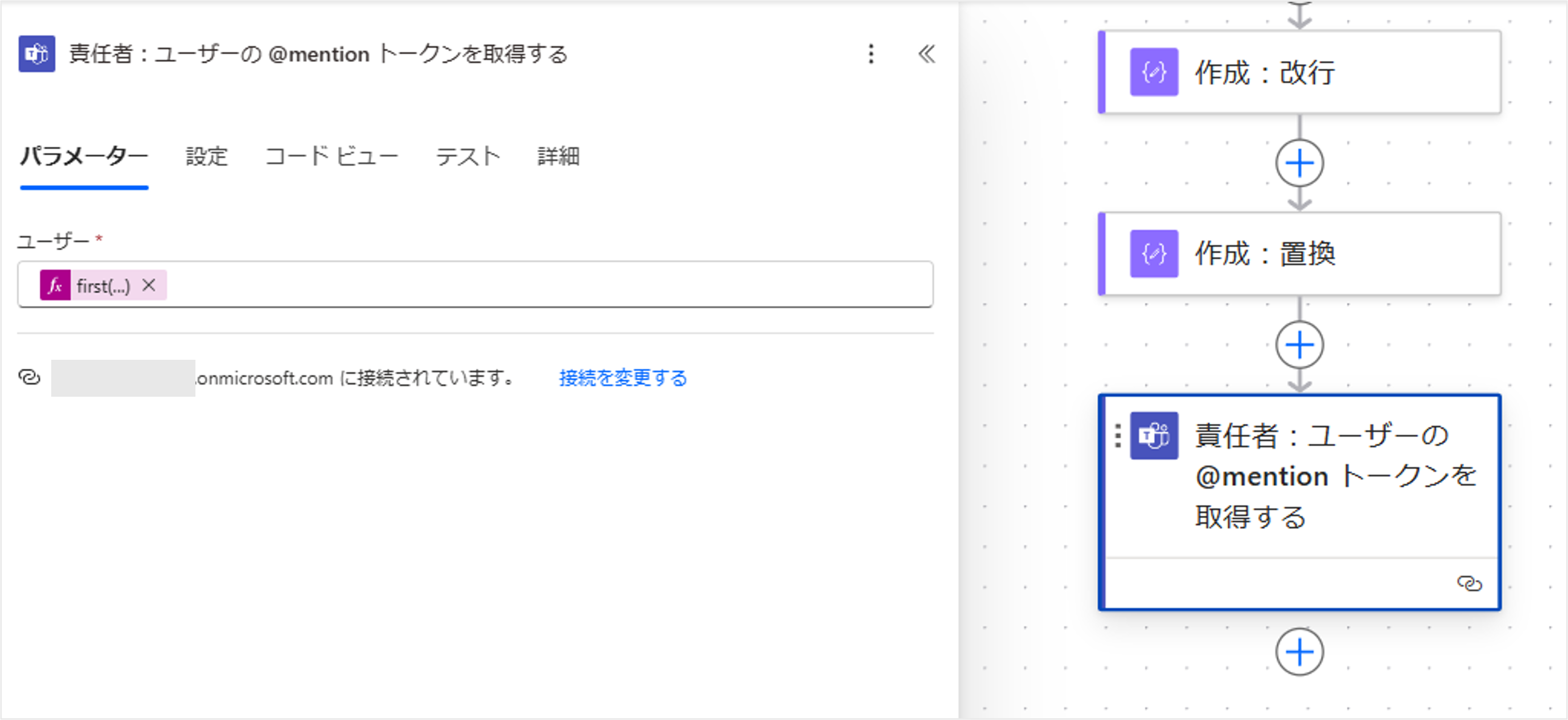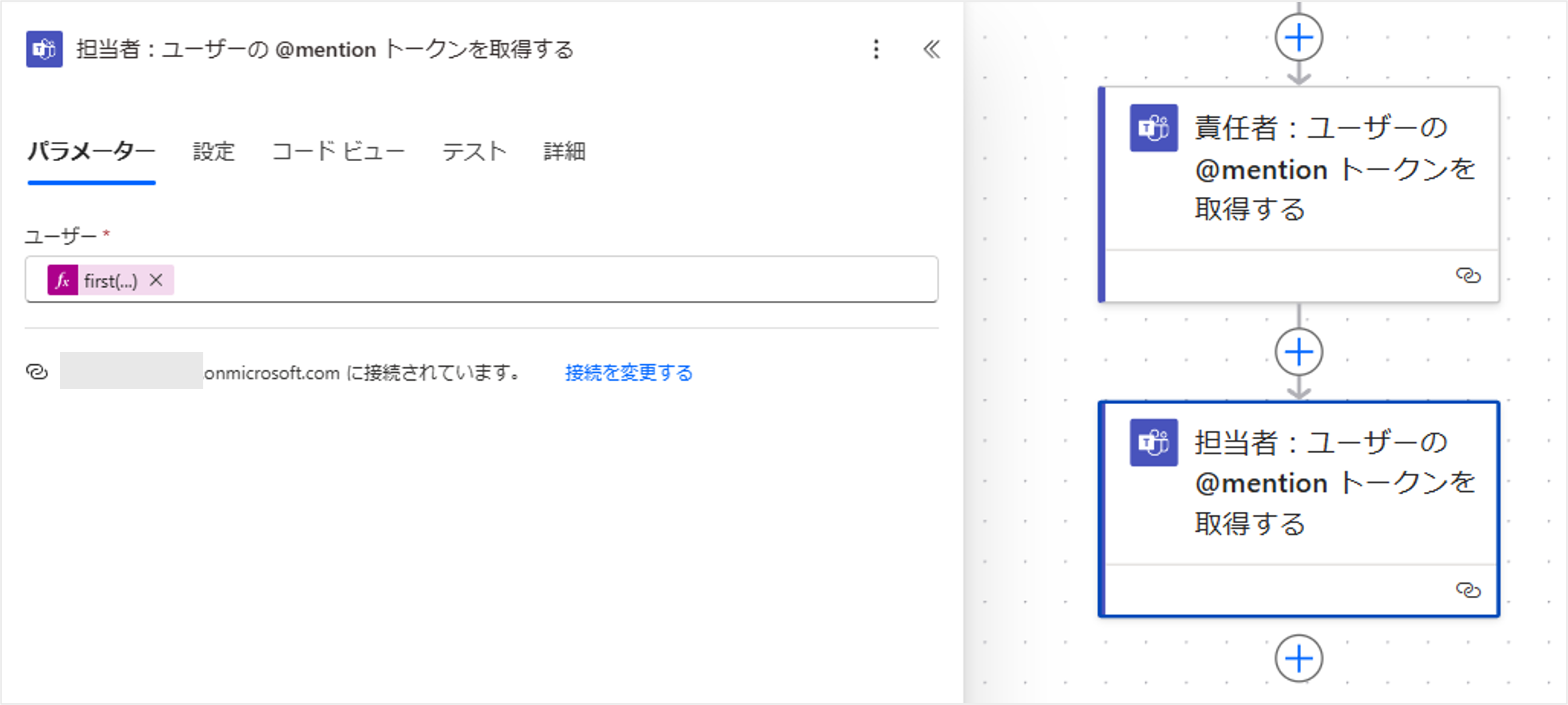 Microsoft Teamsの「ユーザーの @mention トークンを取得する」アクションを追加します。