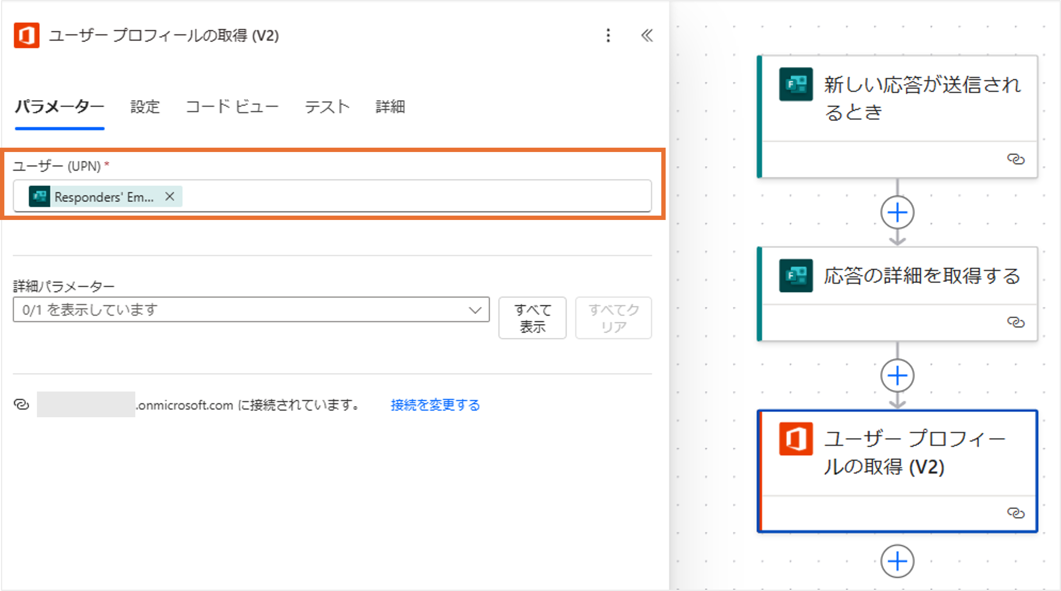 Formsで回答した人の部署、役職、メールアドレスを取得するためにこのアクションを追加しています。