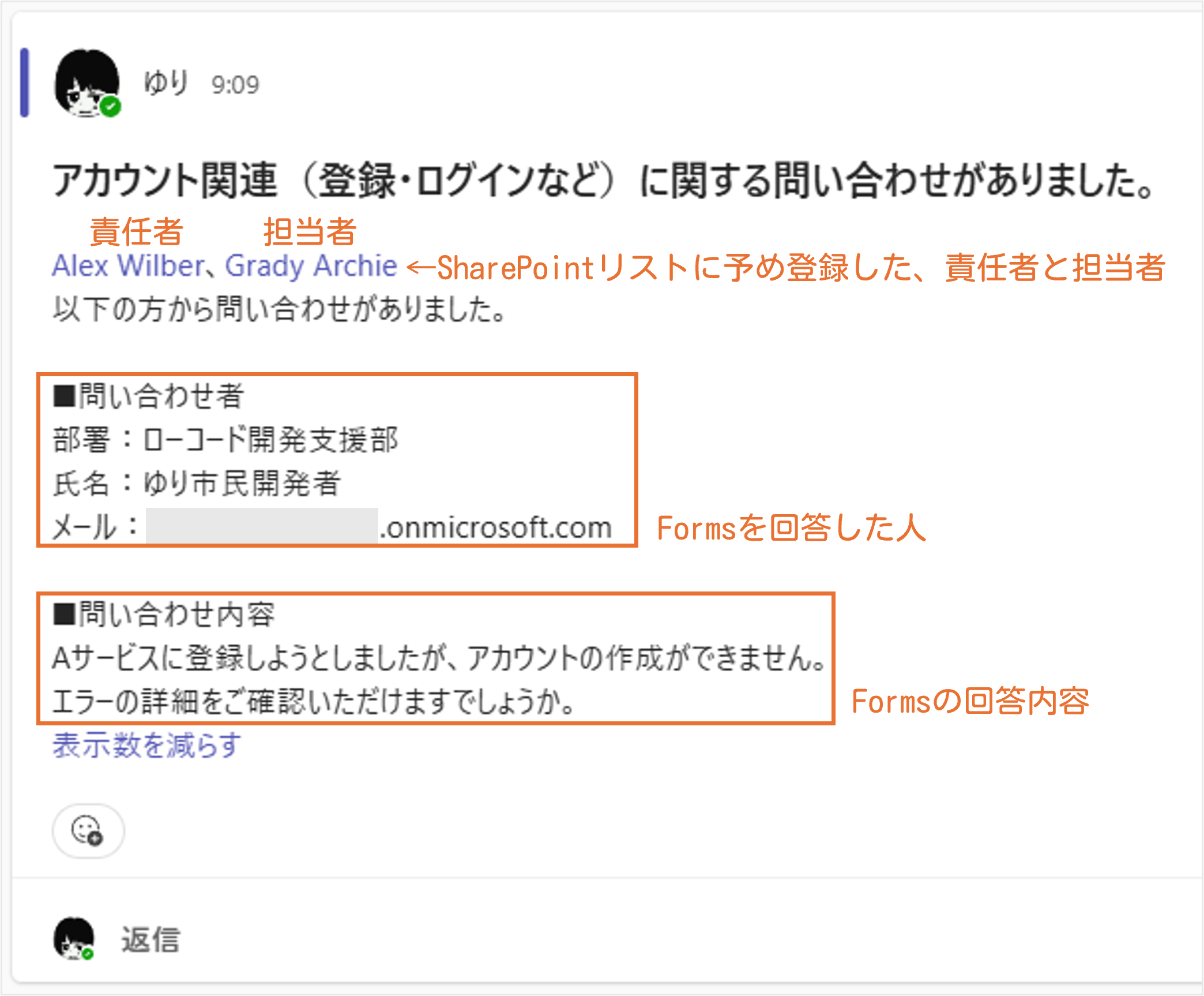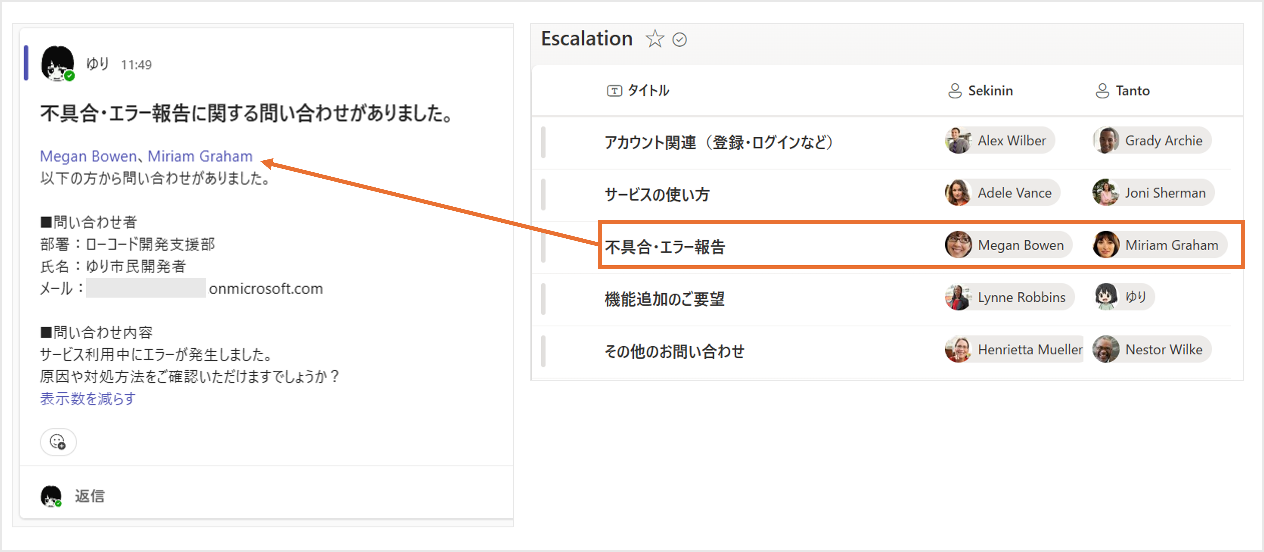 Teamsチャネルに投稿され、SharePointリストの「不具合・エラー報告」で設定していた責任者と担当者にメンションがいきました。