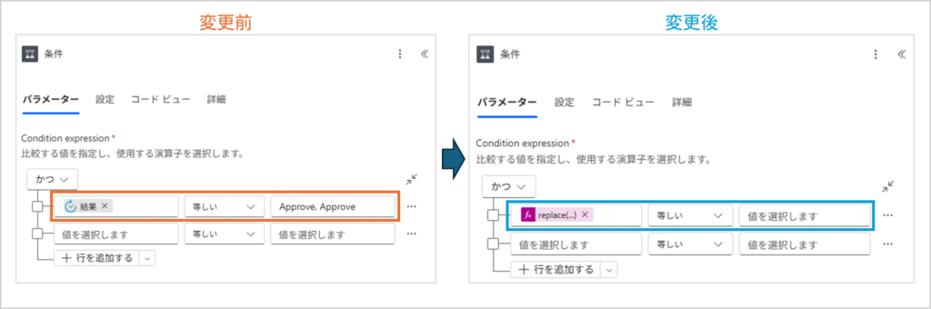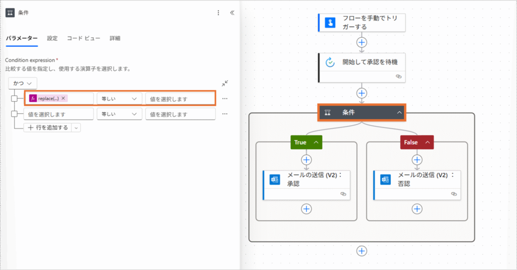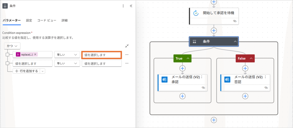 条件アクションを追加し、左辺(値の選択)をクリックして、「式」タブに以下のコードを入力してください。