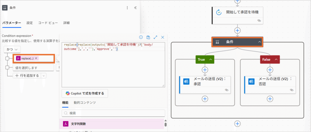 replace(replace(outputs('開始して承認を待機')?['body/outcome'],',',''),'Approve','')