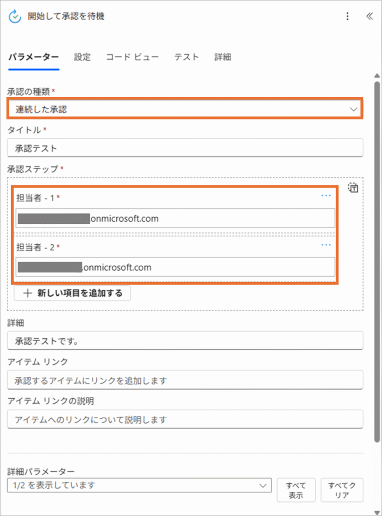 今回は「開始して承認を待機」アクションで、承認の種類を「連続した承認」にしました。